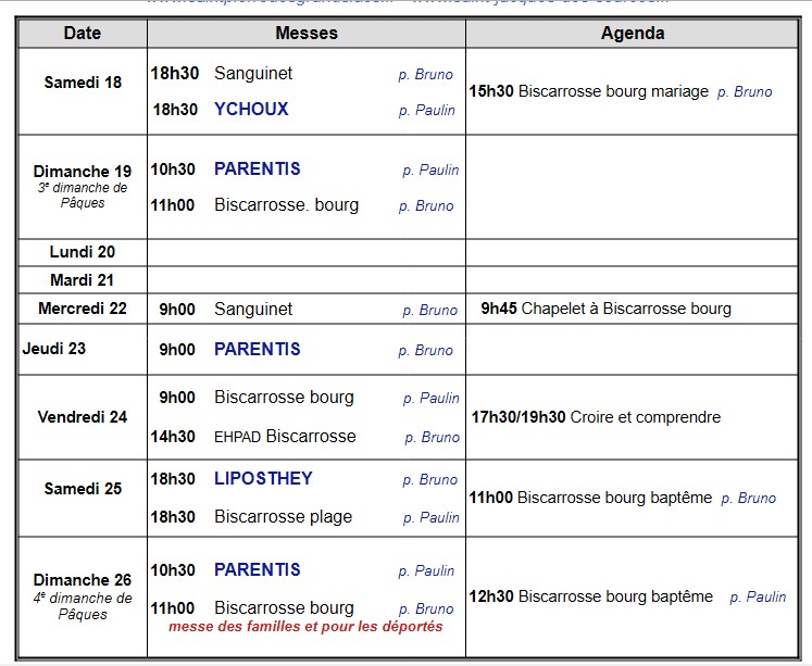 Pour joindre le presbytère (Biscarrosse) : 09-55-54-11-44 / 05-58-78-12-21